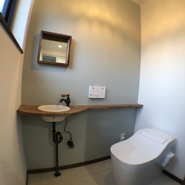 キチン前の腰板には渋いブルーの塗装、造作の洗面台にも濃いブルーのタイル、照明器具もどこか懐かしさの中にもお洒落を感じさせてくれます。